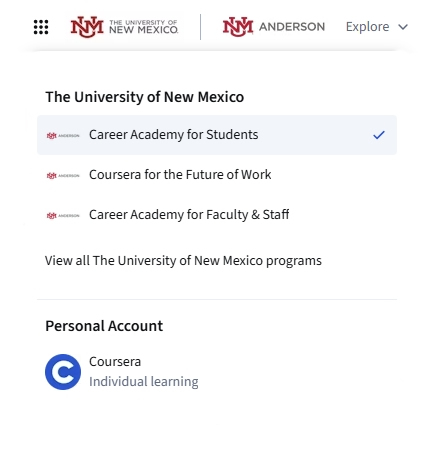 UNM Anderson is proud to partner with Career Academy from Coursera, one of the world’s leading online learning platforms. Through this collaboration, Anderson students can explore different career paths, master real-world skills through hands-on learning in fields like data analytics, digital marketing, data science, and more, and earn Professional Certificates from the world’s leading companies, including Google, Meta, and IBM.